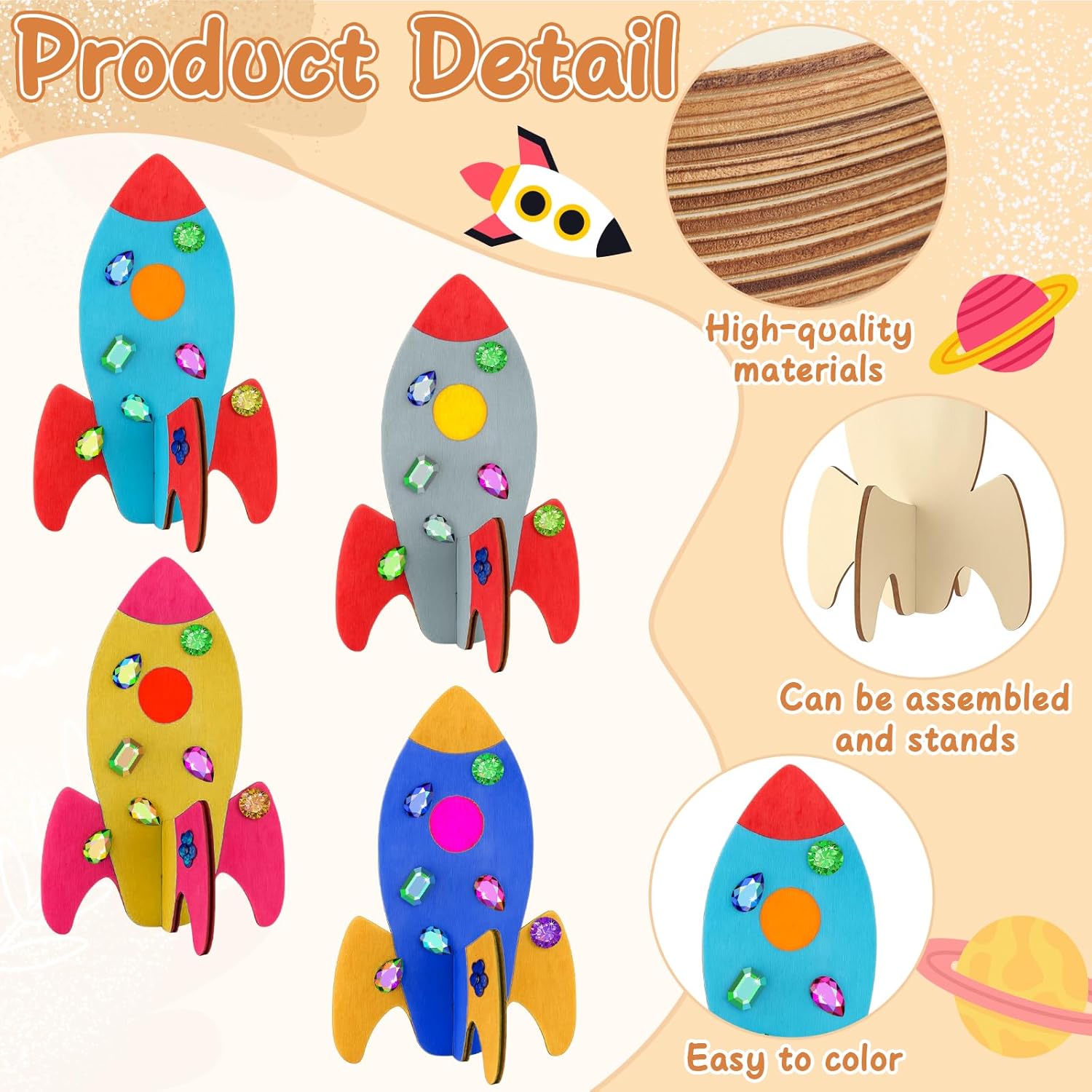 Features: Ideal Group Activity or Solo Adventure This versatile kit is suitable for various settings, from classrooms to birthday parties or quiet time at home. With 48 assembled rockets, it can accommodate group activities, encouraging teamwork and social interaction. Alternatively, it can also be applied for solo crafting sessions, offering a quiet space for individual creativity to flourish. Each wood rocket invites children to dive into their imagination, making it a flexible and enjoyable activity for any occasion. A Creative Gift for All Young Innovators Looking for a gift that combines fun, education, and creativity? Our DIY wood rockets make a nice present for birthdays, holidays, or educational rewards. Designed to inspire and delight, this rocket space wooden craft set is more than just a toy, it's a gateway to a world of exploration and artistic expression. Gift your child the joy of crafting and the inspiration of space exploration, making every crafting session a memorable voyage. Specifications: Material: Assembled rocket: wooden Acrylic paint set: propylene Diamond stickers: acrylic Color: Assembled rocket: wood color Acrylic paint set: multicolor Diamond stickers: multicolor Size: Assembled rocket: 5.91 inches high Package includes: 12 x Assembled rocket 1 x Painting kit 200 x Diamond stickers Notes: Manual measurement, please allow slight errors on size. The color may exist a slight difference due to different screen displays. Suitable for people over 6 years old, and it's recommended to use under the supervision of adults in case of choking risk