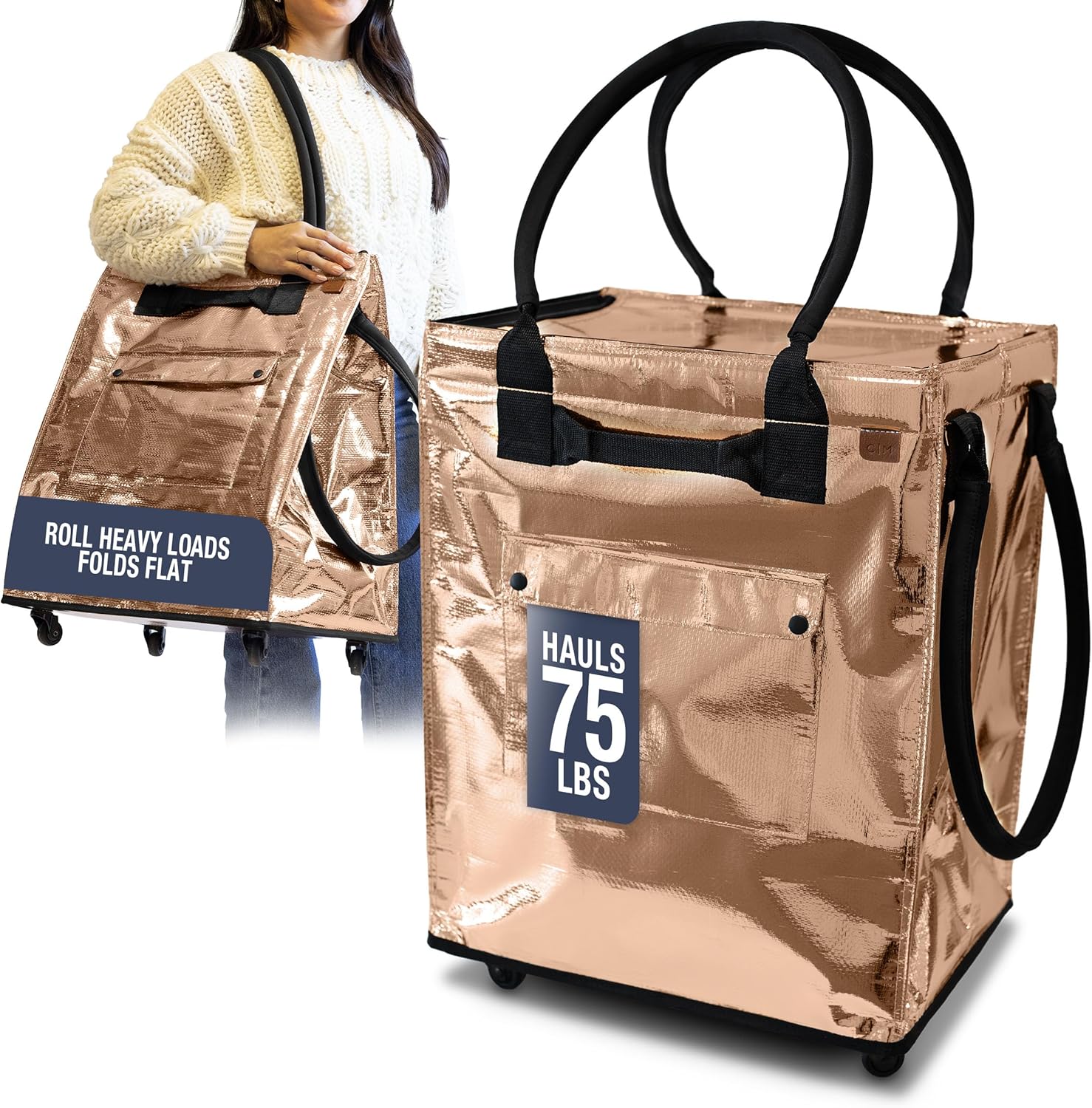 Tackle errands, laundry day, game day and so much more with this ingeniously designed collapsible rolling tote. When not in use, the shopping bag with wheels folds completely flat for storage in tight spaces - perfect for apartments, dorms, and small homes. When duty calls, the rolling bag with wheels expands to provide a generous 90L capacity for all your carrying needs.The padded handles are strategically positioned to for comfortable one-handed rolling, making it easy to carry the basket and hold onto a child's hand. This thoughtful design is especially valuable when navigating stairs, allowing you to hold the railing while transporting heavy loads safely.The construction is reinforced with heavy-duty stitching and a sturdy frame. This robust design supports up to 75 pounds of contents, whether they be laundry, groceries, or camping supplies. The rigid structure maintains its shape when filled, ensuring reliable transportation without sagging or collapsing.With its spacious 90L interior, this rolling bag with wheels handles multiple loads of laundry or bulky household items with ease. The design works as both a transport solution and temporary storage. It performs best as a mobile carrier rather than a hamper when empty.This multifunctional carrier excels in numerous scenarios beyond laundry day. Use it as a grocery bag on wheels, organizing camping supplies, storage solutions, or bulk buy store runs. Its practical design adapts to whatever carrying task you need to accomplish.Crafted with premium materials and thoughtful features, this shopping bag with wheels delivers excellent long-term value. The water-resistant construction wipes clean easily with a damp cloth, ensuring it remains looking great for years of use.Whether you're a busy parent navigating laundry day, an apartment dweller with limited storage, or someone who values practical, versatile household tools, this collapsible large rolling tote combines the space-saving design with durability for everyday challenges.