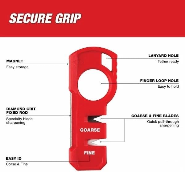 Compact Knife Sharpener has a large finger loop for a SECURE GRIP and added control while sharpening. This pull-through sharpener has three sharpening surfaces compatible with most knives; coarse carbide for quick edge setting, fine ceramic to finish the sharpened edge, and diamond grit for freestyle specialty blade sharpening. It's compact size is ideal for pocketed carry, and has a magnet for easy, convenient storage on the jobsite. This tool is also tether ready.