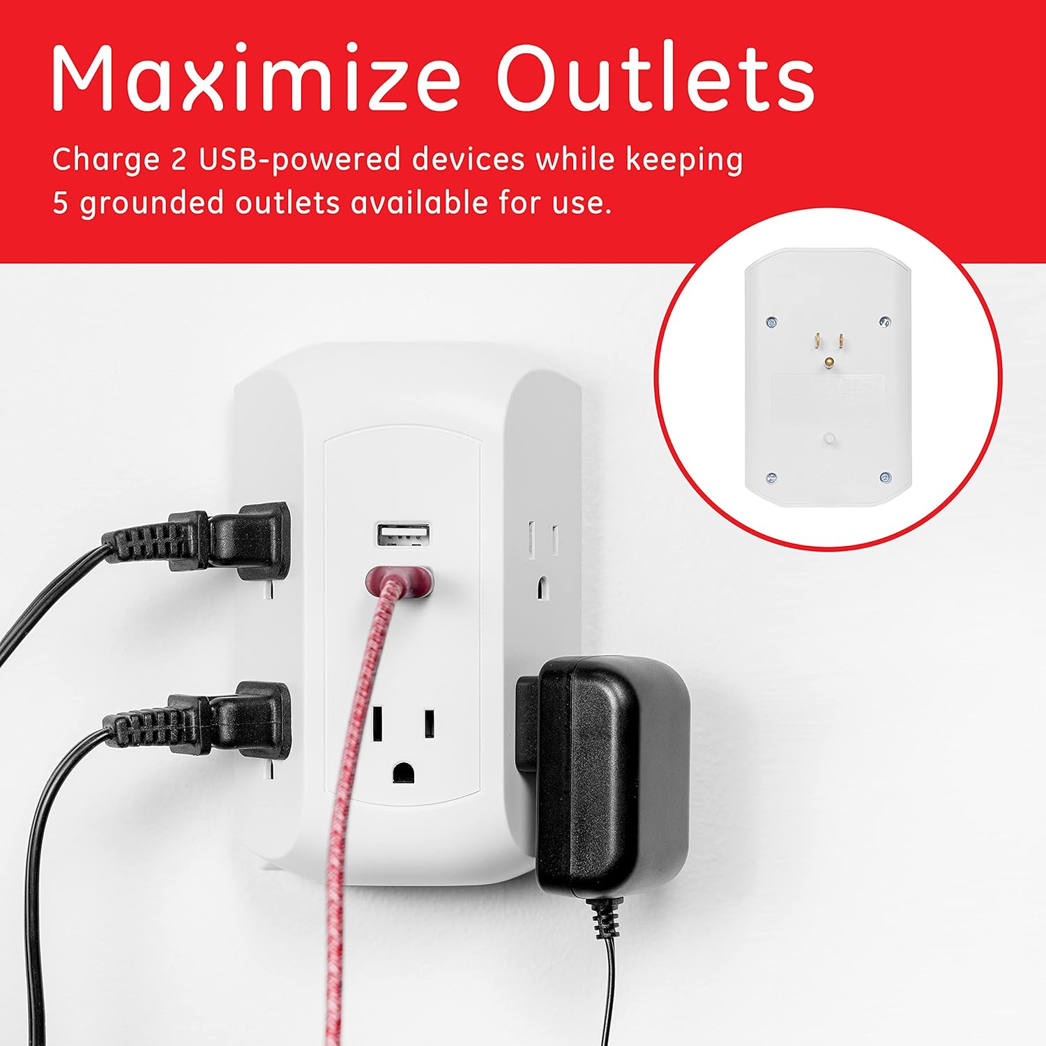 Plug and power with a GE-branded UltraPro™ USB-Charging Surge Protector. Featuring five grounded outlets with 560 Joules of surge protection and two USB ports delivering 2.4 Amps, the plug-in tap transforms your regular outlet into a safe, multipurpose powering station. Power your everyday household appliances, lamps and lights, tools and other electronics while charging the newest laptops, tablets and other mobile devices — all from one location! The surge protector also includes side-access outlets and USB ports to conveniently connect your electronics behind furniture and in other tight spaces. For additional convenience, UltraCharge technology returns your devices to full power up to 40% faster than traditional 5W chargers. The white finish provides a sleek look to this outlet adapter that is sure to complement existing décor and blend in seamlessly to any office space, workstation or media hub. Diversify your power source with a GE-branded UltraPro USB-Charging Surge Protector.