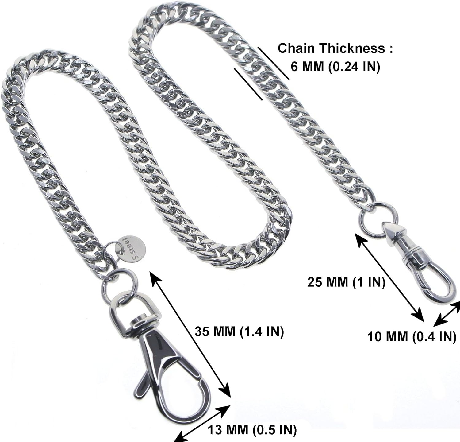 1. 100% Brand New with Excellent Workmanship & Materials 2. Material : Stainless Steel 3. Color : Stainless Steel Original Color 4. Chain Pattern : Steel Double Cuban Link Chain Item Size (approximate) : - Chain Length : 32 CM (12.5") approx. *Not Include the Clasps - Chain Thickness : 6 MM approx. - Albert Swivel Clasp - 26 X 10 MM approx. - Swivel Lobster Clasp - 35 X13 MM approx. Package Includes: 1 X Pocket Watch Chain + 1 X Black color Velvet Pouch