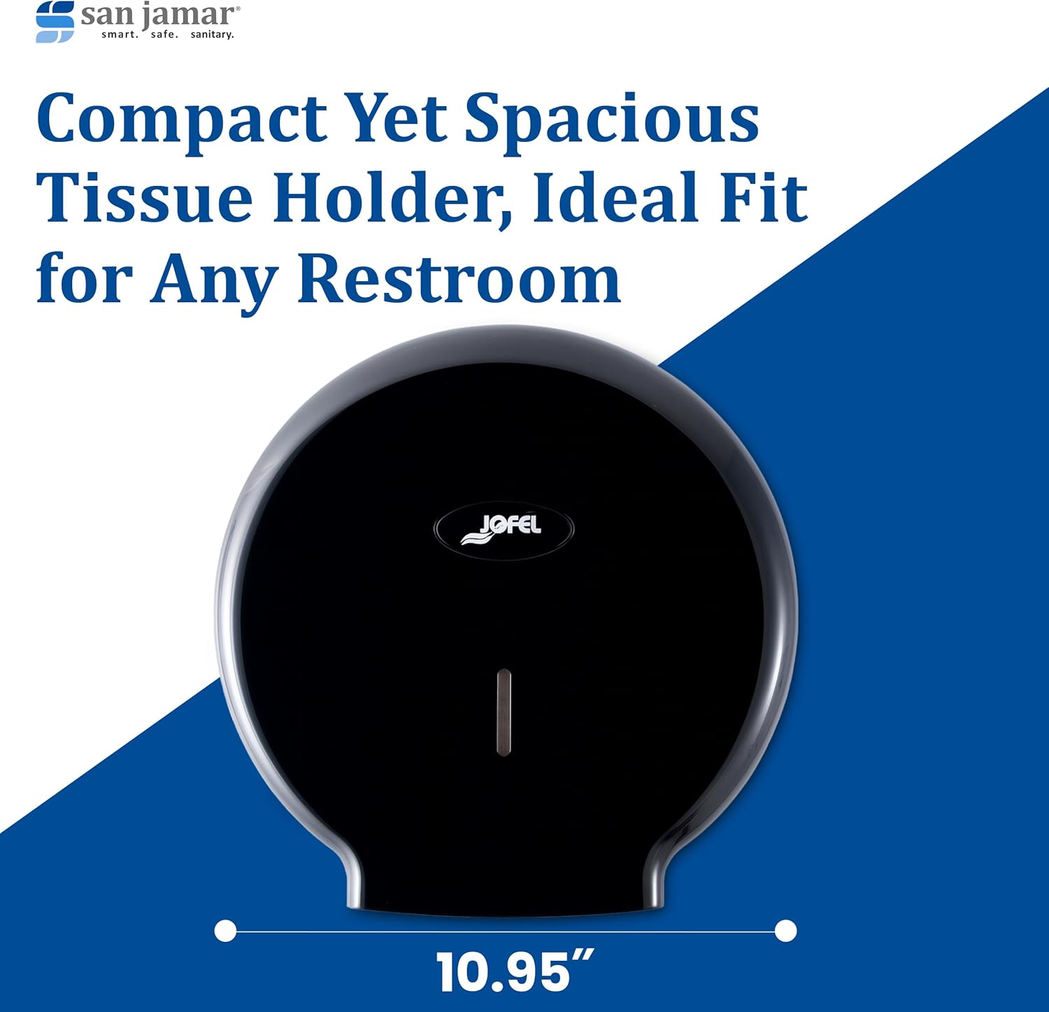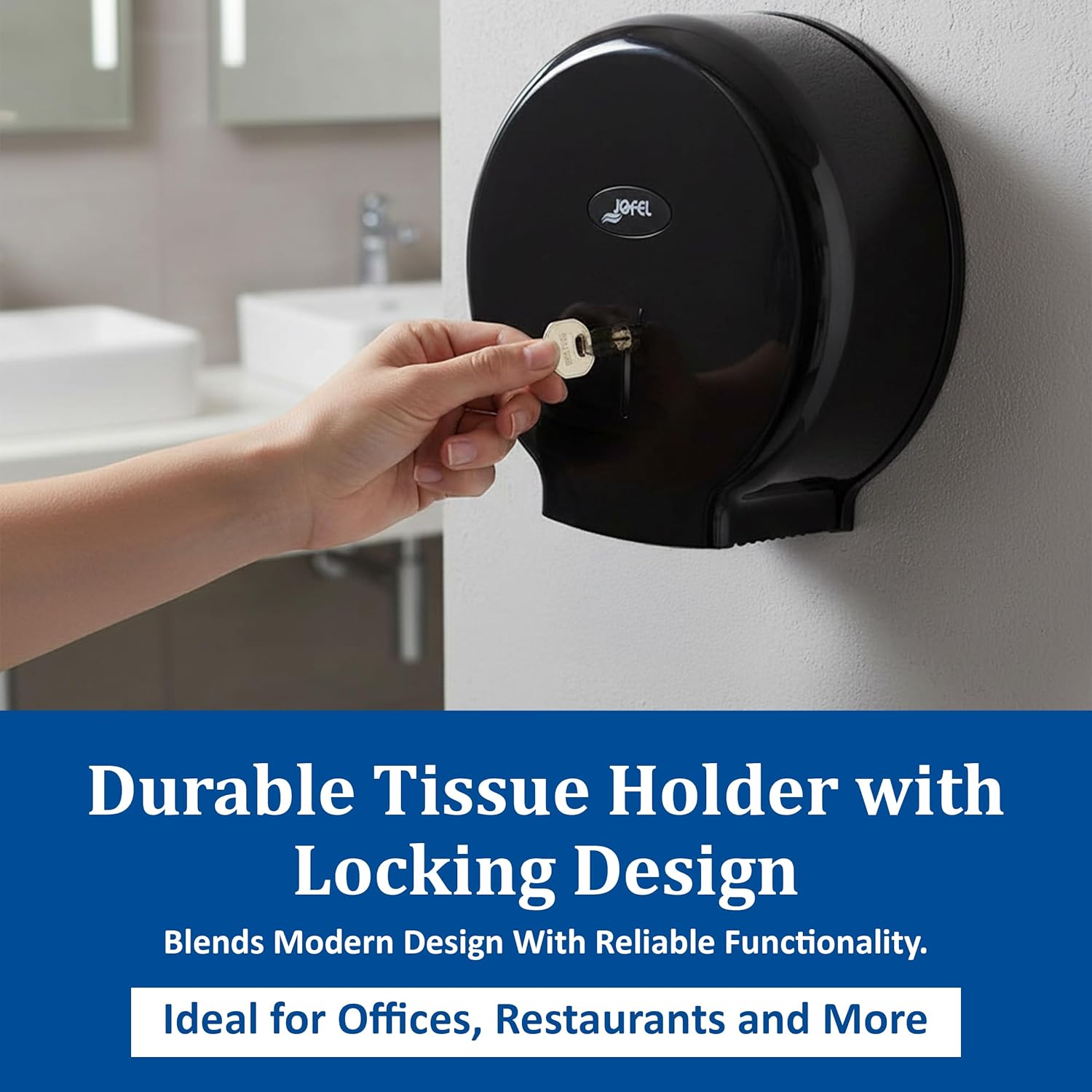 Introducing the Jofel Valor Single Tissue Dispenser, the perfect addition to any commercial restroom. With its sleek and modern design, this dispenser seamlessly blends in with any decor while providing the functionality that your patrons need. The Jofel Valor dispenser is designed for high-capacity storage, holding rolls up to 950 feet with a diameter of 10 inches. This ensures that you won't have to constantly refill the dispenser, saving you time and effort. The dispenser features a key lock, ensuring that your tissue rolls are kept safe and secure. The hinged cover design allows for easy and convenient access to the tissue rolls when needed. Additionally, the viewing window lets you easily monitor the remaining tissue levels and determine when it's time for a refill. Constructed with durable materials, the Jofel Valor dispenser is built to last and withstand frequent use. It's easy to install and maintain, making it a hassle-free addition to your restroom. In summary, the Jofel Valor Single Tissue Dispenser offers high-capacity storage, a secure key lock, sleek and modern design, convenient viewing window, and easy-to-use hinged cover design. It's the perfect choice for any commercial restroom seeking a reliable and functional tissue dispenser.