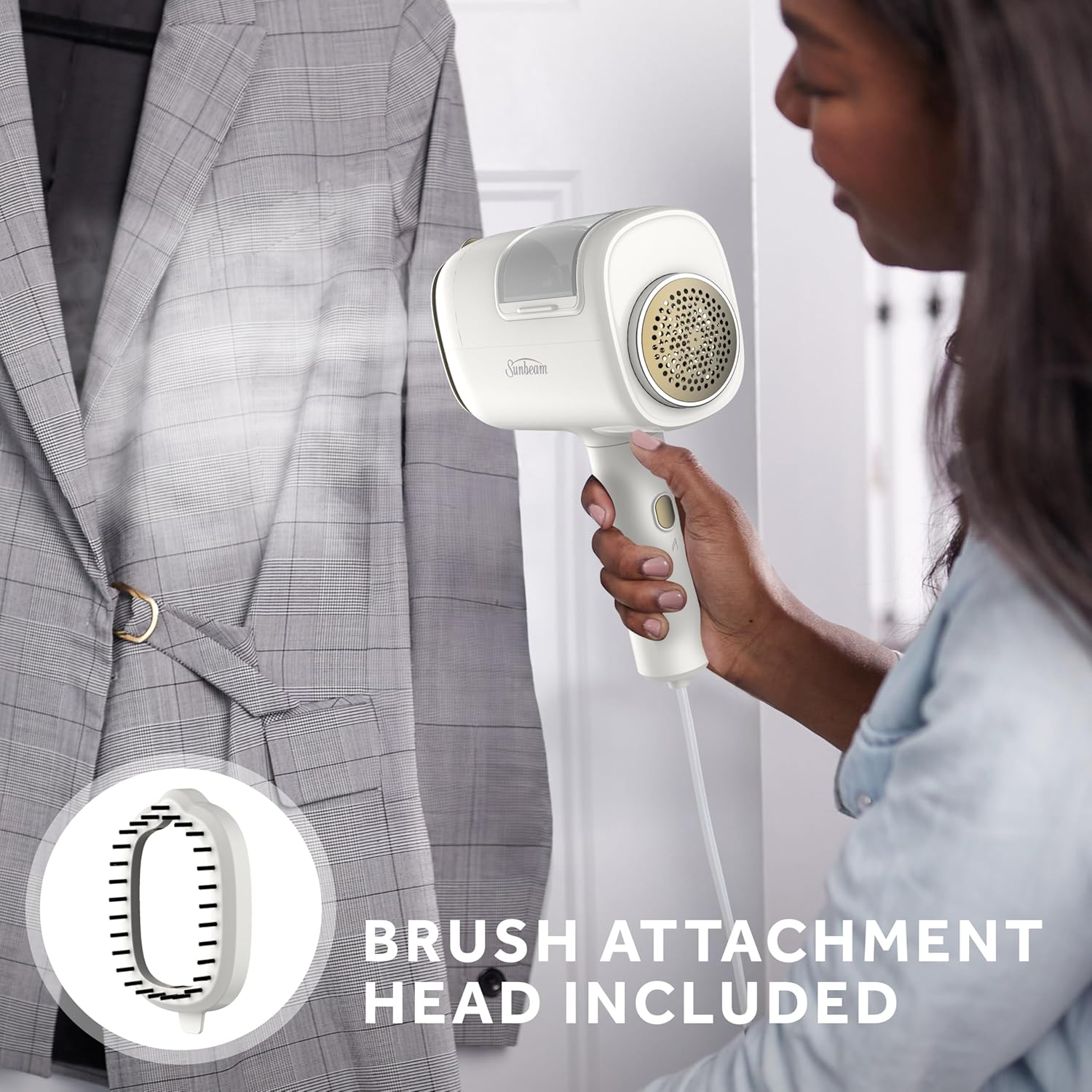 Sunbeam ReviveStylem 3-in-1 Steam,Iron, and Fabric Shaver combines 1000W powerful steam and heat to deliver quick and effective results, ensuring your garments are wrinkle-free in no time. This versatile device is designed with Integrated Electric Shaver technology, featuring a unique 6-leaf blade for rapid lint removal, giving your clothes a smooth and flawless finish. The Honeycomb Mesh Protection safeguards your fabrics from damage, providing efficient steaming and ironing performance while ensuring a gentle touch on your garments. Its Durable Die-Cast Ceramic Soleplate ensures smooth, wrinkle-free results with every pass, offering easy glide and long-lasting durability. With Dual Functionality, you can switch seamlessly between Horizontal Ironing and Vertical Steaming, providing an all-in-one solution to meet all your garment care needs. The 90ml Detachable Water Tank offers easy filling and detaching for convenient use and storage, making it a perfect tool for hassle-free garment care. This garment steamer is designed for easy storage with its Foldable Feature, helping you save space when it's not in use. The 10-foot power cord gives you ample room to move freely around your ironing or steaming area, while the Quick 30-Second Heat-Up Time allows you to start working right away with minimal wait. The complete set includes a water fill cup, storage bag, fabric brush, and heat insulation cover for added convenience. Backed by a 3-Year Limited Warranty, this garment care steamer ensures reliable, long-lasting performance, making it an essential tool for your home or office.
