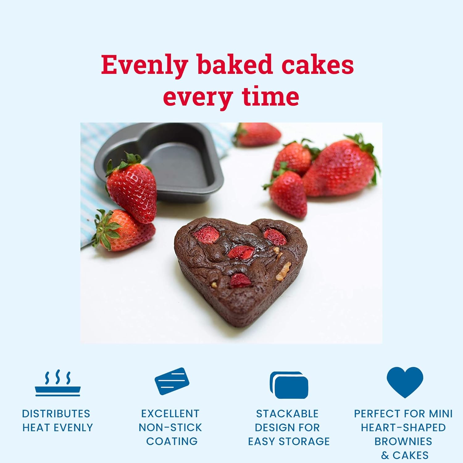 Product Description Tala Bakeware Accessories - 2 Mini Heart Cake Pans The Mini Heart Cake Pan from Tala is a must-have when baking sweet heart-shaped mini brownies and cakes. Made from sturdy carbon steel with a superior non-stick coating designed to evenly distribute weight and easy food release so you get a consistent bake. Bake Your Heart Out Set of 2 heart-shaped cake tins Distributes heat evenly Excellent non-stick coating Stackable design for easy storage Features wide flat handles Masters of Icing, Baking and Cooking Since 1899 Established in 1899 by Frederick Taylor and Thomas Law, Tala has become a trusted source of high-quality kitchenware, bakeware, and cookware. It’s the helpful kitchen companion that has been passed down through generations. An iconic symbol of British baking, Tala has over 100 successful years of production in the UK! Set Contains: 2 x Mini Heart Cake Pans