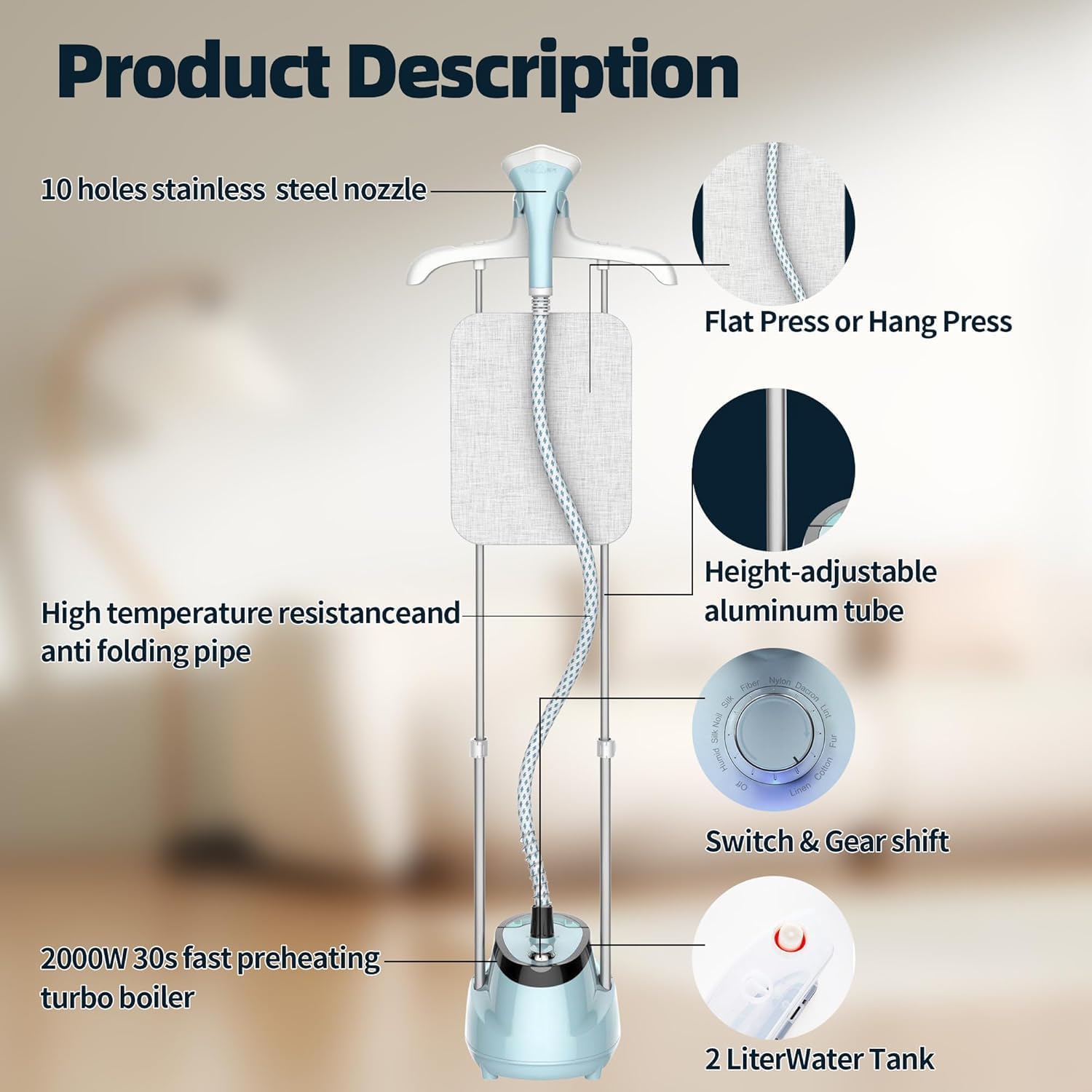 | Product Benefits | Efficient wrinkle removal, quick heating, continuous steam, versatile for different fabrics and user needs, easy to use and store |